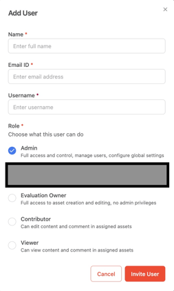 - Select the user's role from the dropdown: Admin, Assessment Owner, Contributor, or Viewer. Refer to the Understanding User Roles and Permissions article if you are unsure which role to assign