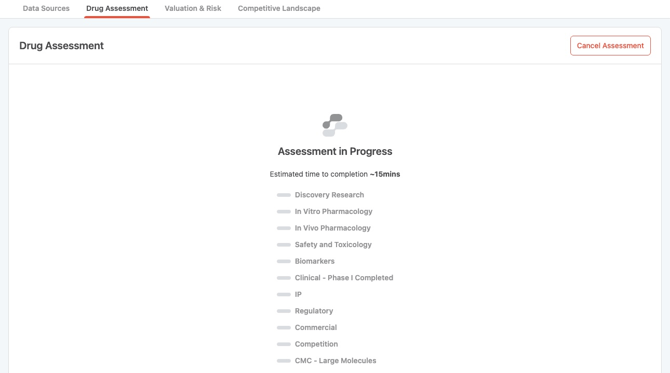 An assessment is the analytical core of every evaluation. Each time you run one, Prudentia's AI engine interrogates all connected data — your data room documents and the linked public sources — to produce a structured output across a set of clinical, scientific, regulatory, and commercial domains. Assessments can be run multiple times within a single evaluation as new data becomes available.