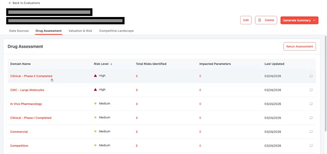 If new data has been added to the Data Room, or if you want to refresh the assessment for to pull the most recent public information into the findings, click Re-run Assessment from the Drug Assessment tab.